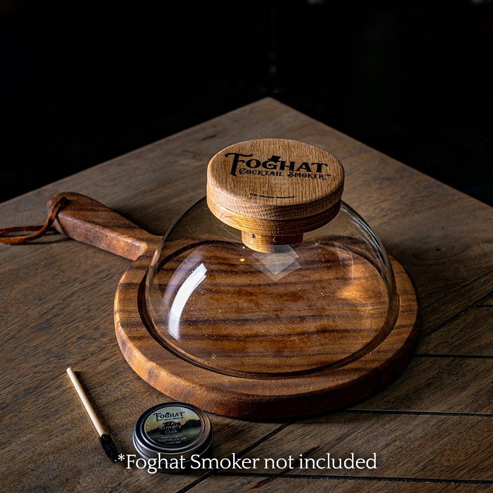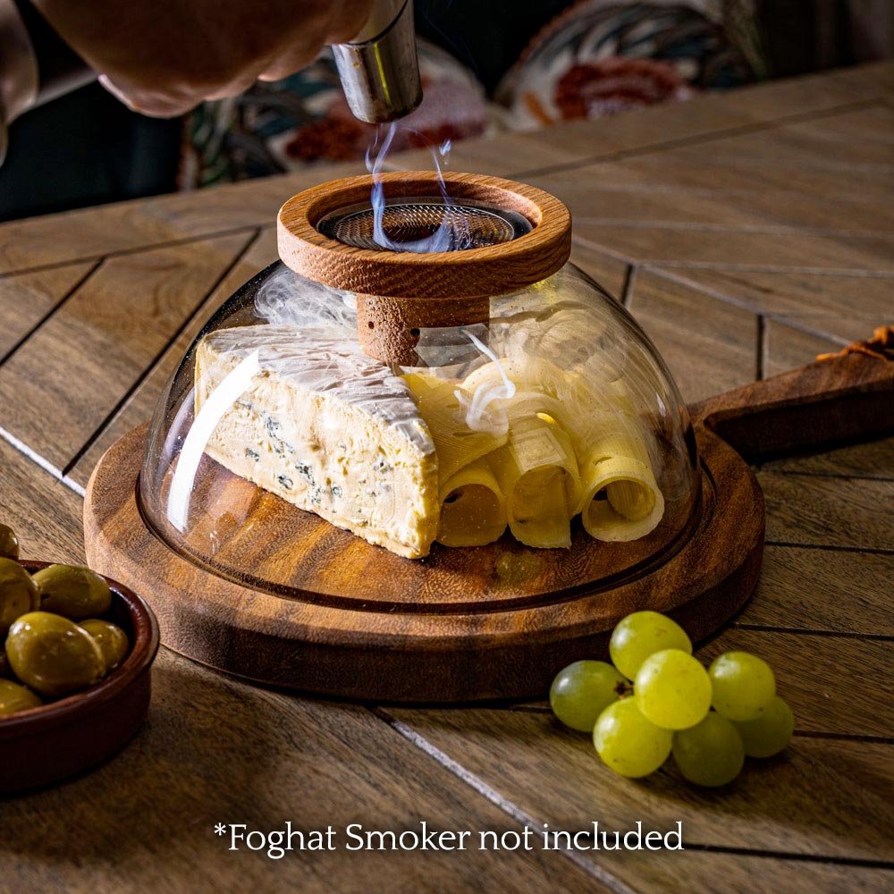 Formed from a solid piece of white oak, the Foghat Smoker sits comfortably inside the glass cloche which is paired with a beautiful hardwood board.