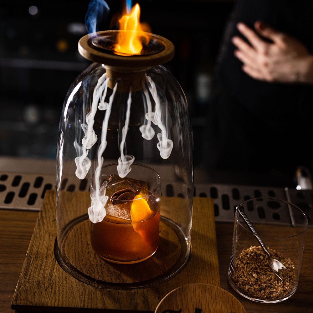The Highball Cloche Set is ideal for enhancing flavour and adding theatre to your drinks and cocktails.