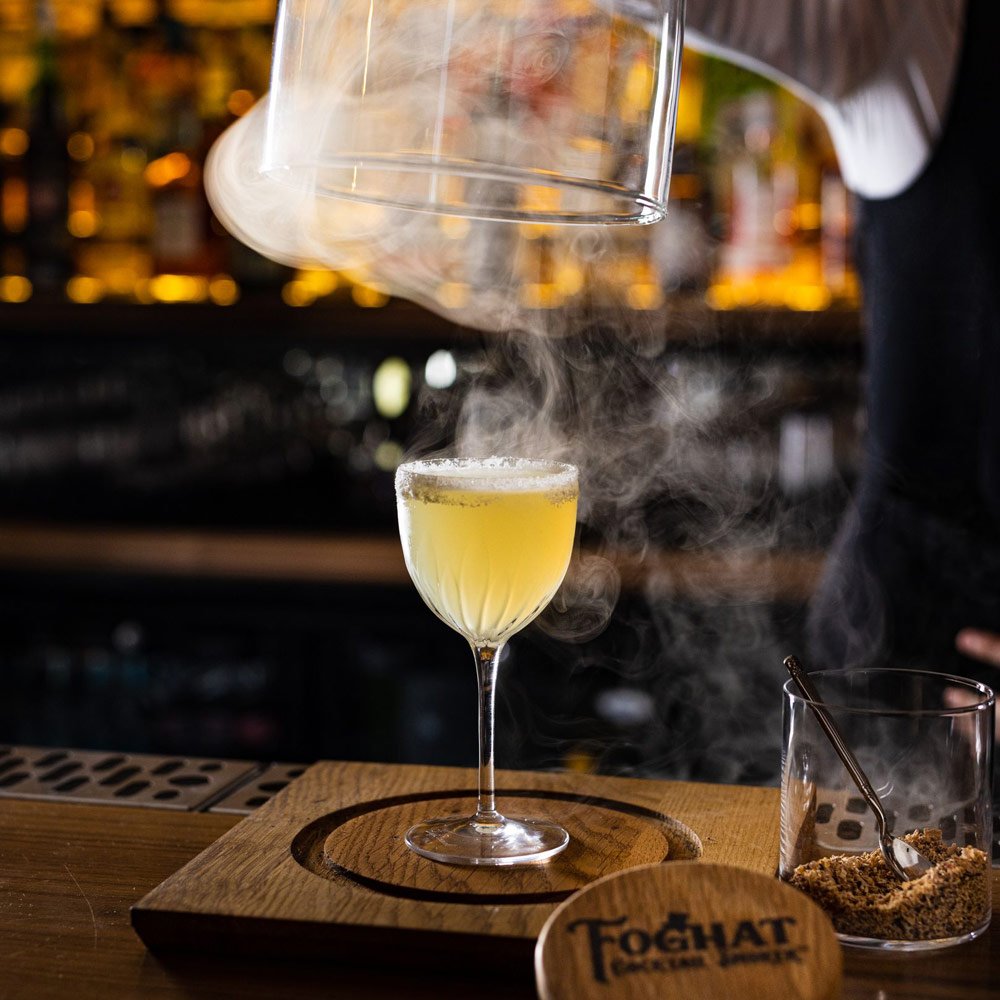Hand-turned from a solid piece of white oak, the Foghat Smoker sits comfortably inside the Highball Cloche and is paired with a beautiful Saba Board on which to stand your glass.